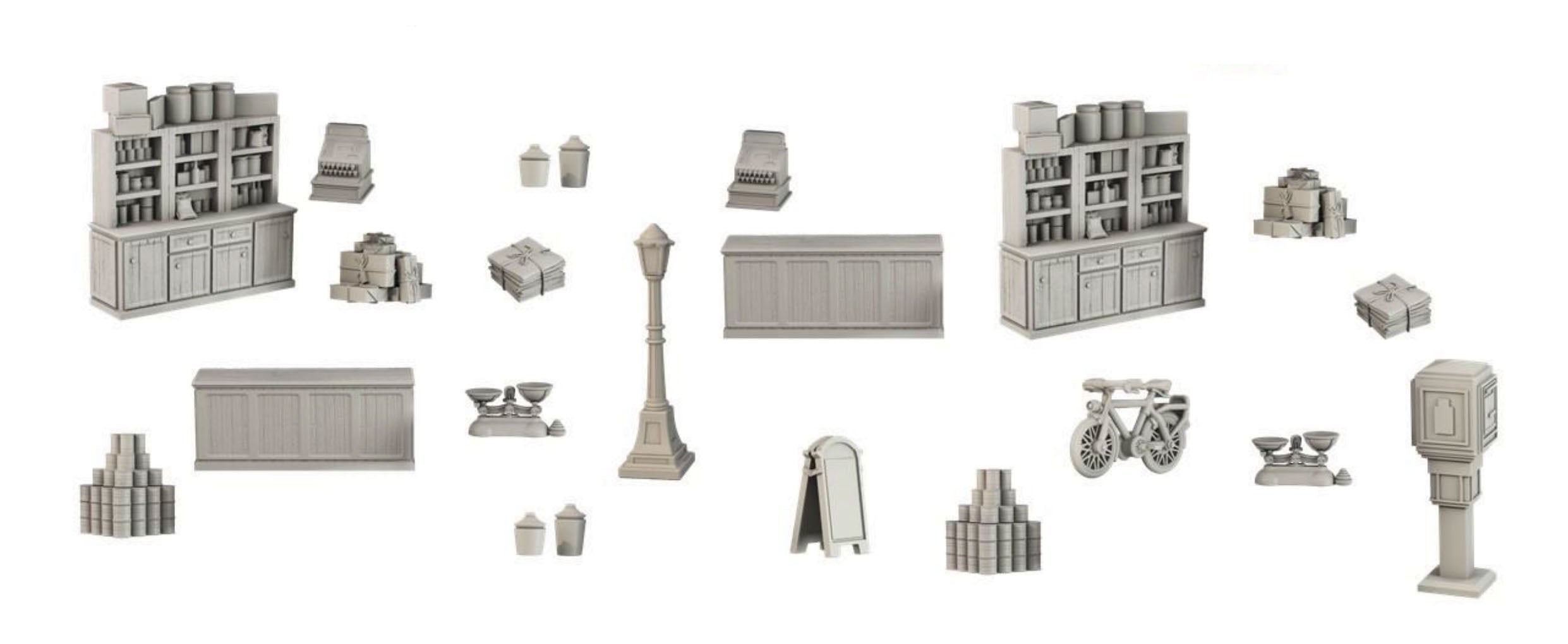 This set contains 20 pieces to furnish a table top shop setting. The scale is 28-30mm, making them perfect for many fantasy and historical games. The pieces are cast in high quality plastic and are preassembled, ready to play straight out of the box.