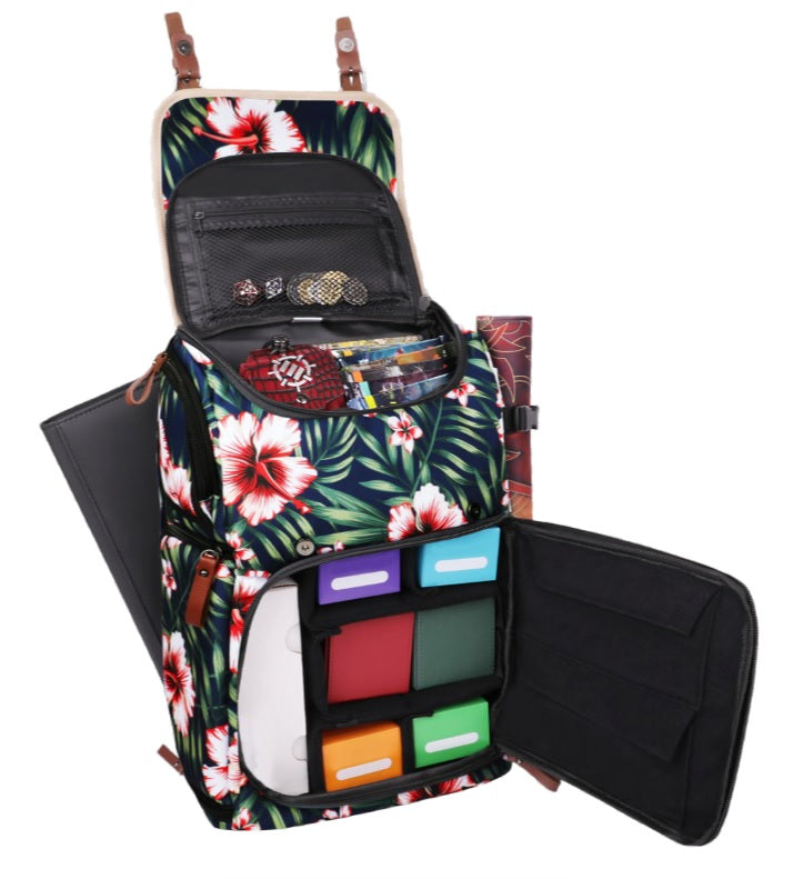 Keeping your Trading Cards and Accessories Organized and Readily Accessible!Travel-Ready ConstructionHeavy-duty buckles , handles and zippers make for long lasting use in any condition. The high-quality nylon and fabric construction is reinforced with thick padding to always protect your Trading Card. Padded shoulder straps and back also provide a comfortable and light-weight feel. The backpack comes with a rain cover tarp to protect your gear under heavy rain or snow.Custom Compartment ConfigurationAccessory pockets provide access to your dice set, metal tokens & many other TCG accessories. Side door allows you to grab your Trading Cards quickly , so your always available to play. Padded dividers lets you customize the trading card and accommodate your equipment however you prefer.Wear as a Backpack or SlingTuck-away shoulder straps allow you to wear the bag on one or both shoulders! You can also wear across your chest as a sling. Stow away unnecessary straps into the luggage handle slot. Waist strap included for weight management and comfort. Includes a convenient playmat holding system with strap, foot holder and padded compartment (16.5"L x 10.5"W) for up to 15.6" trading card binder.