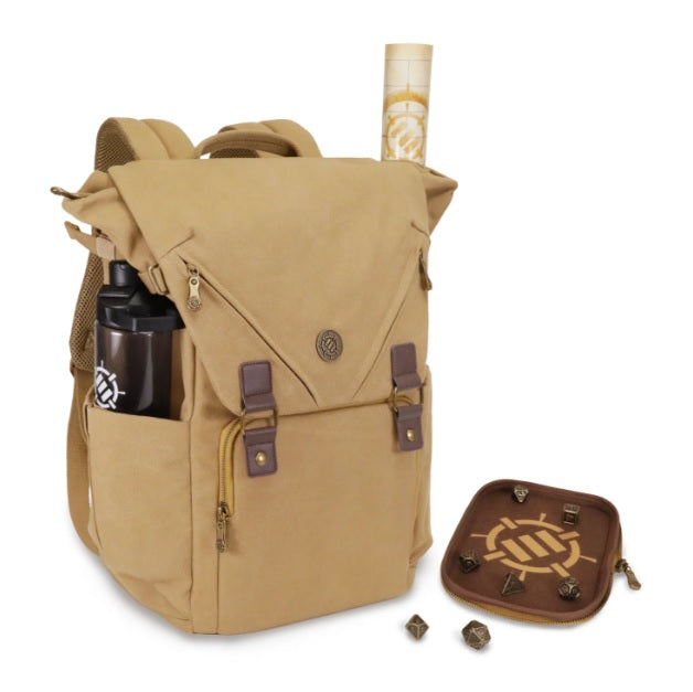 ENHANCE Venture RPG Canvas BackpackEVA REMOVABLE DICE TRAY - Unlike many RPG backpacks, the Venture Canvas RPG Backpack comes equipped with a removable dice tray so you will always be ready when a critical role needs to happen. The removable dice tray slot also has a pocket to store some of your smaller accessories like dice, tokens, small notebooks, and much more.GAME MASTER`s CAMPAIGN BACKPACK – DMs demand TTRPG accessory travel storage large enough to carry more books, larger binders, DM screens, a laptop or tablet, and many more knick-knacks and snacks. ENHANCE Tabletop`s Venture Canvas Backpack stashes all of game night`s adventuring loot as the ultimate TTRPG organizer and travel bag. How does it level up RPG transport even more? It has built-in padded backpack straps to make it the most practical bag of holding for any DM. A chest strap, luggage slot, and carrying handle are also included in order to make travel very comfortable and easy. The venture bag also has 2 expandable side pockets to store a DnD map and/or a water bottle. Go from game night to the office with the NEW Venture Canvas Backpack!BUILT-IN RPG BOOK CELLAR – To master every battle, we forged a bookshelf-inspired vault suited to hold up to 4-6 upright RPG books. The top-loading book compartment of this DnD Backpack is built for easy access and organization of a Dungeon Master`s essential RPG`ing library, from guides and rule books to reference binders and notebooks. QUICK ACCESS LOOT POUCHES – Any great backpack is measured by the number of built-in pockets available to organize an arsenal of accessories. Two pockets on the flap of the canvas bag are the perfect spots to store some of your smaller accessories like tokens, dice, counters, chargers, and phones. Dungeon Master Canvas RPG Backpack Exterior Dimensions: 20 x 12 x 7.5 inches.