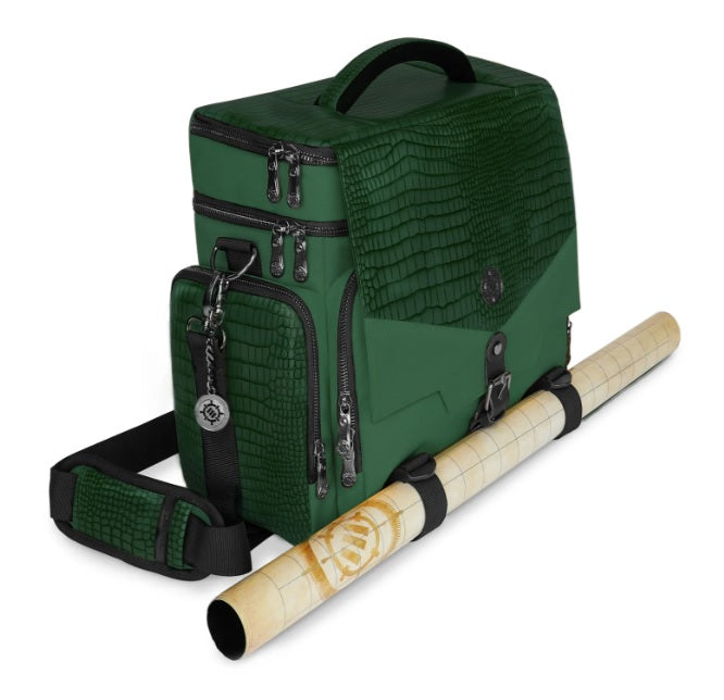 ENHANCE Tabletop Adventurer`s Travel DnD Bag - Collector`s "Dragon Scale" EditionGet your adventuring party together and explore the realms with the ENHANCE Tabletop RPG carrying bag. Designed specifically to help Dungeons Masters or players of any tabletop RPG bring everything they need to their next session.Now upgraded with the power of Dragon Scale for its exterior, forged from the spoils of war using techniques from an age long forgotten. The Collector`s Edition also comes with a collectible metal charm keychain and exclusive holographic sticker to mark the authenticity of your Collector`s Edition RPG bag. Show off your reward with the detachable metal charm that can be taken anywhere.The bag has a messenger style design and features both a rugged carrying handle and adjustable shoulder straps. The exterior is made from a rugged and durable polyester fabric reinforced with interior padding to keep the contents protected as well as adding structural support to bag.The bag features a variety of compartments for storage. The main compartment opens up to reveal a spacious and padded interior with an included divider to organize books and reference guides of most sizes. The bag accommodates books from Dungeons and Dragons, Shadowrun, Mythras, The Burning Wheel, Mouse Guard, Pathfinder and many more publishers/games.The top compartment of the bag features a miniature figure storage space with an included foam organizer capable of holding sixteen 28mm miniature figures. This section is ideal for storing preferred minis, player characters, NPC’s, or the party’s next challengers. ENHANCE your tabletop experience with the Collector`s Edition Adventurer’s Travel DnD Bag.