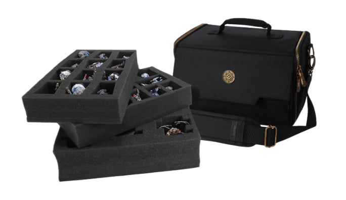 ENHANCE Tabletop Wide Base Miniature Figure SatchelKeep your favorite party of heroes, villains, and monsters ready for action in this compact miniature figure carrying bag. It features 3 foam trays to securely store and protect your miniatures: one 12-slot tray for wide base minis, another 13 slot tray for wide base minis with different slot sizes, and a 60mm thick customizable pick & pluck tray for larger or irregular models/tanks. The bag’s padded walls provide extra protection from drops, scratches, and the elements. The exterior is made of a high quality nylon fabric with a rugged texture and features brass metal hardware and zippers. The versatile shoulder strap allows you to carry the bag comfortably and conveniently. Whether you’re heading to a dungeon crawl, a skirmish battle, or a role-playing session, you’ll always have your favorite characters and creatures at hand with the ENHANCE Wide Base Mini Satchel. It’s more than just a bag...it’s a portable showcase of your epic adventures and memorable encounters.Whether you`re a D&D player, RPG player, or dungeon master, this miniature carrying case is the perfect companion bag for anyone needing to store and travel with a starter/backup minis army. The 1st included precut foam tray has 54mm x 30mm top/40mm bottom x 40mm slots, with a total of 12 slots in the tray. Slots are compatible to fit standard wide base minis. The 2nd tray includes 3 different slot sizes for 13 slots: 4 slots: 50mm x 46mm x 40mm, 3 slots: 74mm x 32mm x 40mm, and 6 slots: 50mm x 32mm x 40mm. Plus, the Satchel includes 1 pick-and-pluck foam tray with a customizable area 9.92 x 6.06 x 2.36 inches big.So grab your tools, team up with your fellow adventurers, and let`s go kill some monsters! Or at least display them in style with this handy miniatures storage case. Compatible with all of your favorite roleplaying games, including DnD and Warhammer 40k.Exterior dimensions: 12.25 x 8.26 x 8.07 inches