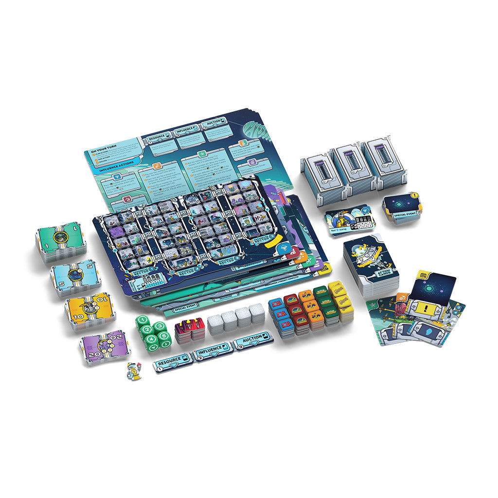 At the start of your turn, you draw three cards (one at a time), choosing one each to discard (which grants you a resource), keep (which grants you an action), or auction (which grants the winner both an action and a resource). To perform the Dutch auction in this game, use either a timer or the game's dedicated app — the more the timer ticks down, the less the winner will pay. Through these cards, you'll manipulate the market, play intergalactic mini-games, and resolve events. In the end, the player with the most money wins!