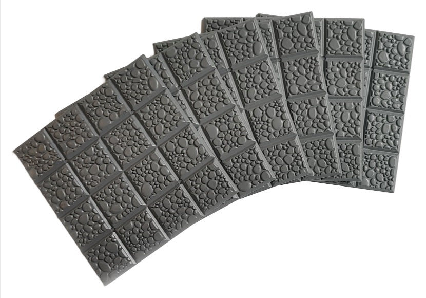 Our terrain tiles are made from 100% recycled polystyrene, including plastic sprues we collect from game and hoby stores! Includes Six Cobblestone - patterned tiles per package. Each 4" x 4" tile is divided into 1" squares, for easy use in tabletop roleplaying games. Tiles can be cut, glued, and painted just like plastic game miniatures!
