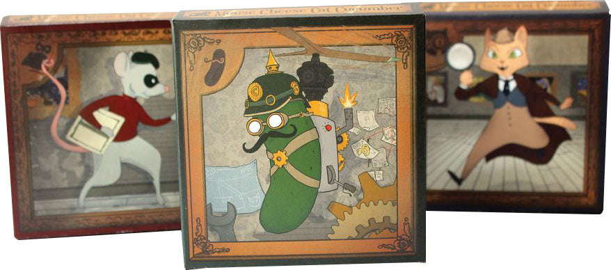 Each character has a hidden agenda: the Mouse wants the Cheese, the Cat wants the Mouse, the Sheese wants everyone to get along (they`re neutral, they`re Swiss), and the Cucumber wants everyone to lose. On your turn, pick a room to add to the clockwork maze. Rooms will rotate. Characters will move. This thinky puzzler will challenge even the most villainous gamer.