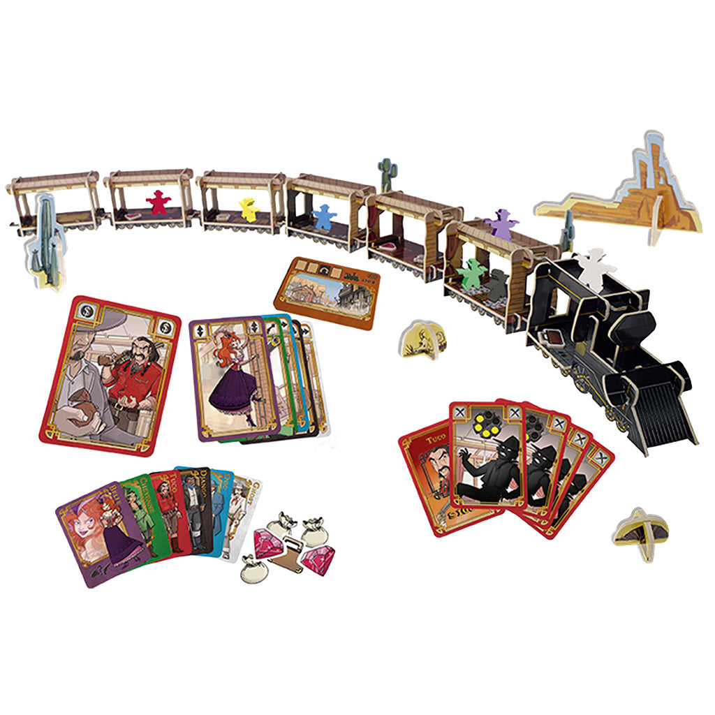 1 Rulebook, 6 Train Cars, 1 Locomotive, 26 Loot Tokens, 17 Round Cards, 1 Marshal, 49 Bullet Cards, 6 Character Cards, 60 Action Cards, 6 Bandit Pawns
