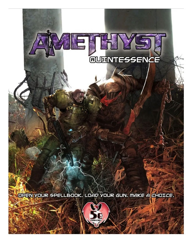 This rulebook includes - A new adaptation of Amethyst based on the 5th edition (5E) of the first fantasy roleplaying game, the defining RPG of the last, current, and most likely next generation. New technology-based rules including vehicle combat and firearms compatible with any 5E game. Eleven new races and over thirty new backgrounds. Eight new classes based around technology. Over thirty new archetypes. High Tech Equipment from revolves to railcannons. Powered armor. Both ground vehicles and aircraft. Over thirty new monsters.
