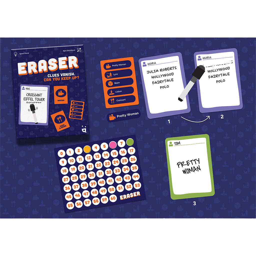 • ERASE CLUES TO RAISE THE DIFFICULTY: Write clues for your teammates, then erase one before passing the board—fewer clues mean tougher guesses and more strategic decisions.