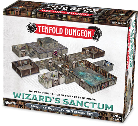 Enter a place of mystique and arcane power with the Wizards Sanctum Tenfold Dungeon set, a haven where practitioners of magic delve into the depths of knowledge. Explore the library, where magical bookshelves line the walls, the potions room, filled with bubbling cauldrons, the portal room, offering transportation to mysterious lands, and more with 12 durable, double sided locations, featuring 1 x 1 grids discreetly layered into the environment.