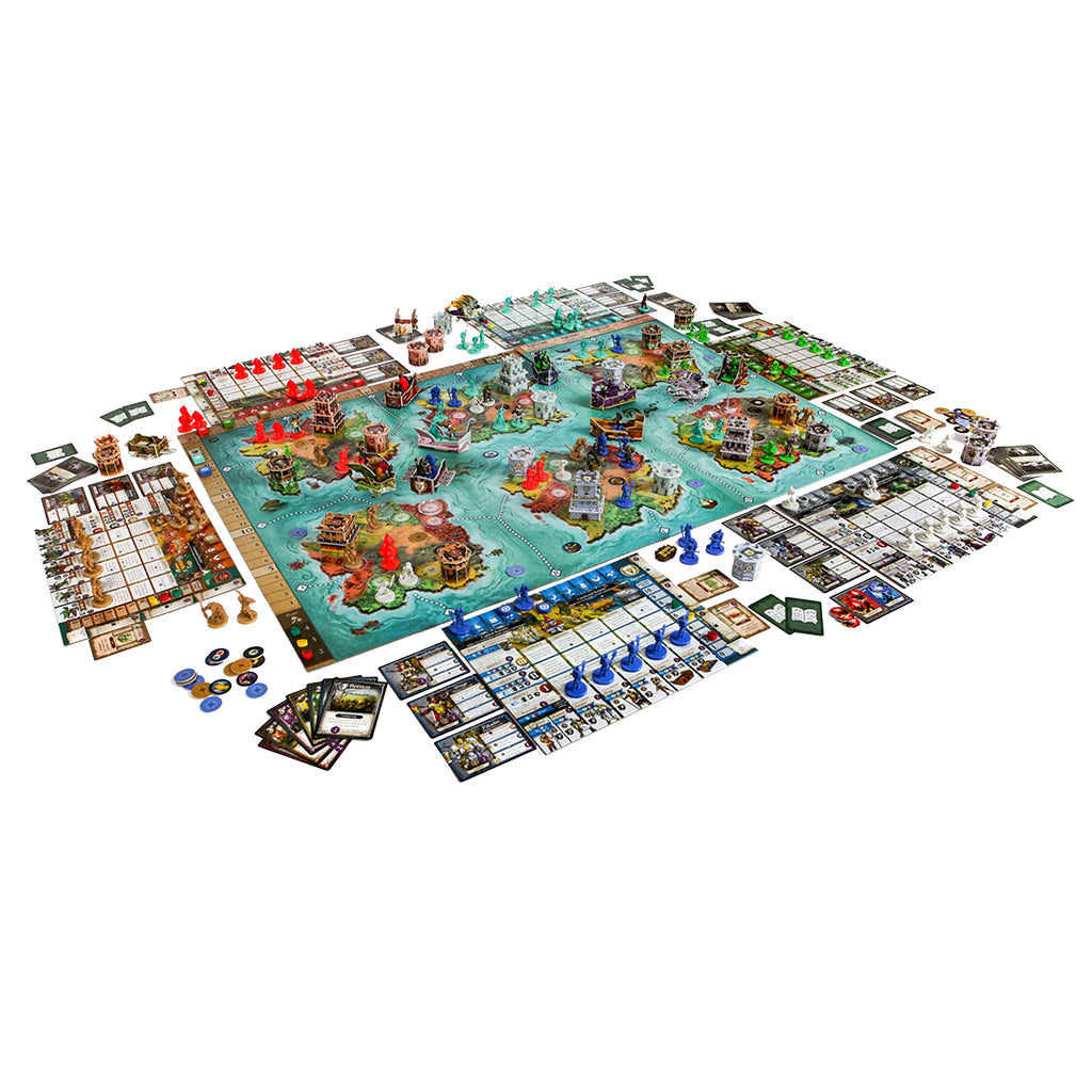 4 Capital City Boards, 80 Miniatures, 12 Hero Cards, 32 Punchboard Constructs, 12 Wooden Faction Tokens, 1 Game Board, 28 Tactic Cards, 60 Spell Cards, 8 Solo Enemy Cards, 94 Exploration Tokens, 4 Plastic Stands, 15 Wooden Resource Tokens, 1 Wooden 1st Player Token, 1 Quick Reference Sheet, 1 Construct Assembly Guide, 1 Rulebook.