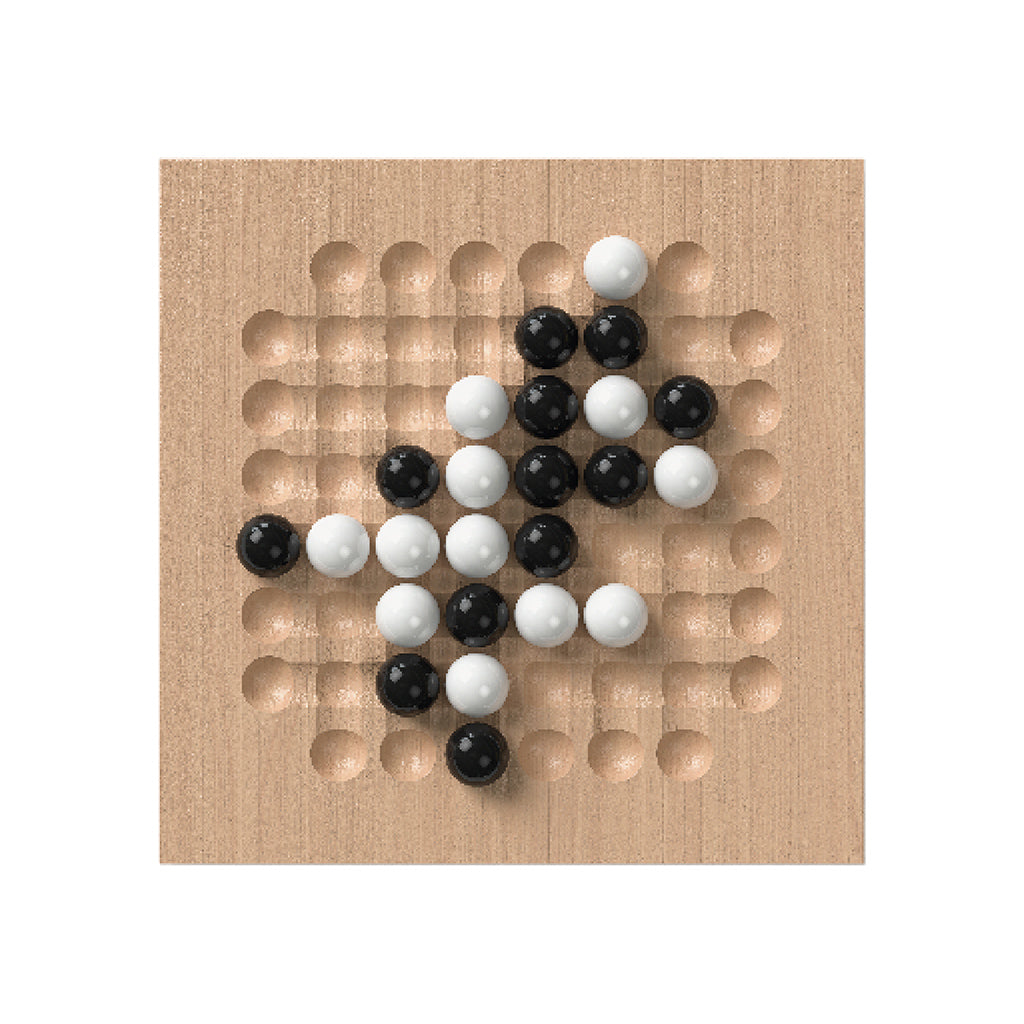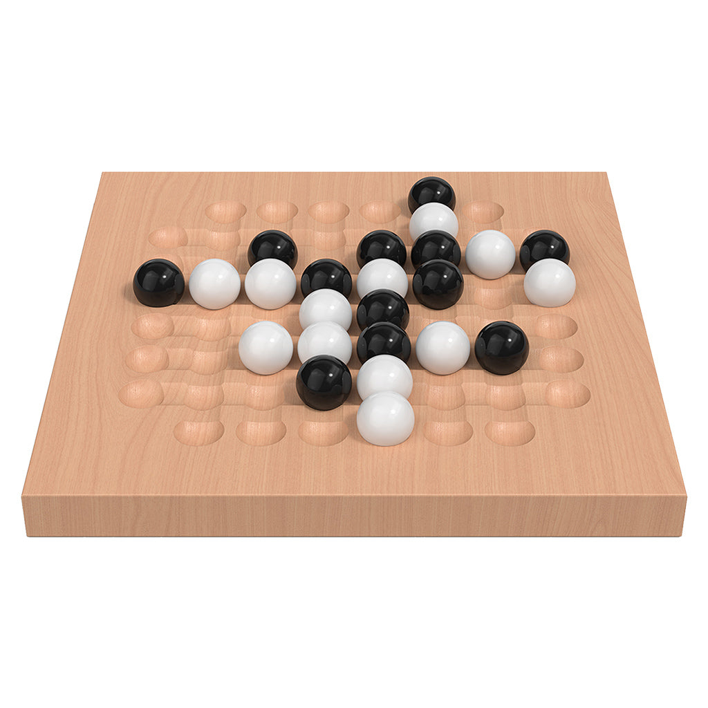 Mabula is a strategic and engaging game for two players that will test your ability to plan ahead and think on your feet. Each player begins with 12 marbles of their own color, placed randomly around the perimeter of the board. The only rule for placement is that no more than two marbles of the same color can be placed consecutively, even around corners.