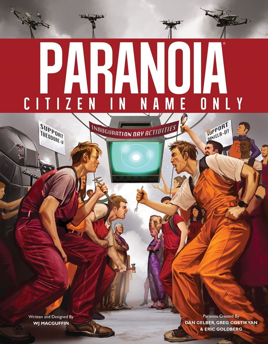 The Computer rules Alpha Complex. FCCCP is a secret society that worships The Computer as a god. What happens when one of the many FCCCP popes decides she can rule Alpha Complex better than a god? Why, she starts taking over one sector at a time. Then she will whip her followers into a frenzy over Citizens In Name Only, people who look loyal but are really terrorists. She even organizes grassroots protests against those damnable CINOs. Wait, that sounds all too familiar....Citizen In Name Only (CINO) is a complete mission for the Paranoia roleplaying game. Players will have two Troubleshooter teams: One that is anti-CINOs and one that is... well, not pro-CINOs per se, but at least against the FCCCP popes takeover. That`s right, players will literally fight themselves as the narrative flips between rival teams, including a climactic battle where players must plan the attack and the defense. Stealthily murdering your Team Leader has never been easier!