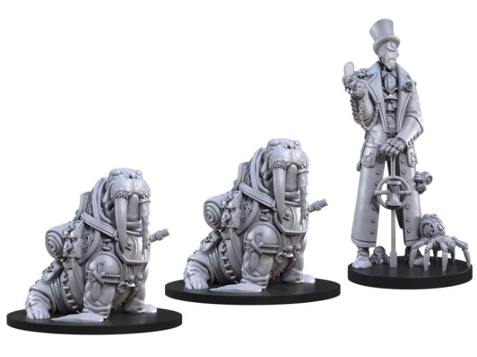 Meet the mysterious Mr. Fugit in your next roleplaying game! Flanked by his imposing Walrus bodyguards, Mr. Fugit is a man with a lot of time on his hands - literally. Find out what secrets he and his henchmen are hiding with the Time in a Bottle set. Inside this box you'll find three fully assembled, highly detailed miniatures ready to paint or play. The adventure for these intriguing characters can be found in the pages of the Animal Adventures: The Faraway Sea sourcebook, where you'll discover whether this curious crew are friend or foe. Or, use these unique characters in any roleplaying game. The only limit is your imagination! Who's in the box? Mr. Fugit - 2x Walruses