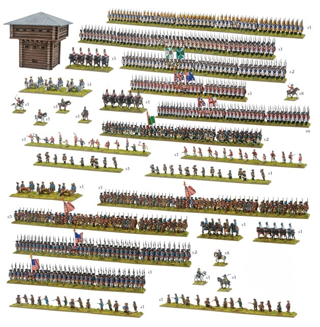 Take a stand for liberty or the Crown with Black Powder Epic Battles: Revolution! This awesome battle set gives you everything you need to begin fighting the American War of Independence on your tabletop. Containing 2,097 soldiers (if you factor in everything, including extras), the box gives you a huge force for both the British and their Hessian and Native American allies, and the American Continental Army, including infantry, cavalry, and artillery, as well as famous personalities and generic commanders to lead them. Also included is the full-length A5 rulebook to get you playing, flag sheets to decorate your units, an assembly and painting guide, and an MDF watchtower for your troops to fight over! Packed with so many gorgeous models, Black Powder Epic Battles: Revolution! is the perfect way to start a mighty collection for this pivotal period in world history. Will you lead the Continental Army to victory and freedom, or deploy the British Regulars to crush the upstart United States? The Black Powder Epic Battles: Revolution! battle set contains:Black Powder Epic Battles: Revolution! A5 rulebook, Assembly and painting guide leaflets, 1 laser-cut MDF watchtower, Enough plastic sprues to make the following (note this is a suggested army composition that can easily be adapted for different sized regiments): 8 mounted British Commanders, 6 British standard line infantry regiments (480 soldiers), 1 British small Line Infantry regiment (60 soldiers), 2 British standard Militia regiments (160 soldiers), 1 British small Light Company regiment skirmishing (15 soldiers), 2 British tiny Cavalry regiments (10 cavalry), 1 British Artillery battery (3 cannon), 2 Hessian standard Musketeer regiments (160 soldiers), 1 Hessian large Grenadiers regiment (100 soldiers), 1 British large Grenadiers regiment (100 soldiers), 1 Indian small regiment skirmishing (15 soldiers), 1 Hessian small Jgers regiment skirmishing (15 soldiers), 1 Hessian tiny Jgers regiment skirmishing (10 soldiers), 8 mounted Continental Commanders, 1 Continental large Militia regiment (100 soldiers), 5 Continental standard Militia regiments (400 soldiers), 2 Continental standard Regulars regiments (160 soldiers), 1 Continental small Regulars regiment (60 soldiers), 1 Continental Artillery battery (3 cannon), 2 Continental tiny Cavalry regiments (10 cavalry), 2 Continental small Riflemen regiments skirmishing (30 soldiers), Plus, plenty of spares (command, skirmishers, cavalry figures) that will allow you to customise your collection, The following Warlord Resin figures: Lieutenant General Charles Cornwallis, Colonel Banastre Tarleton, Sir William Howe, Baron Friedrich Adolf Riedesel zu Eisenbach, Major-General Horatio Gates, Colonel Daniel Morgan, Plastic bases, Full colour British Continental Flag Sheet, 6 six-sided dice