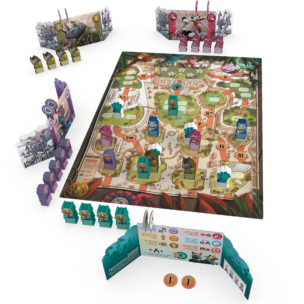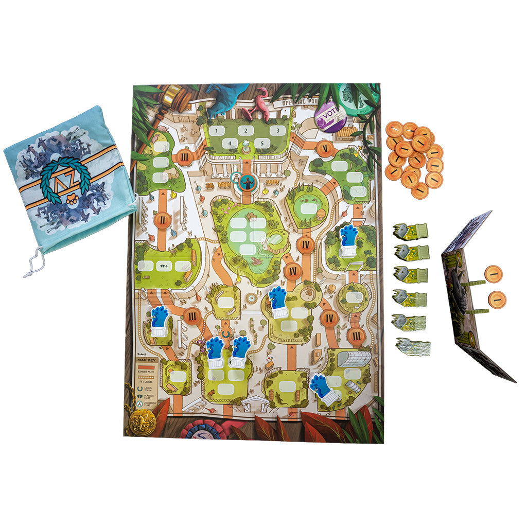 In order to join the star exhibit, each species must campaign its way up the hierarchy of enclosures with the majority support of animal voters. And the lead star will be the species that has earned the most laurels from both raving fans and jealous rivals along the way. How does one gain support and earn laurels? Through crafty politicking, clever negotiations, and ruthless schemes. There can only be one Zoo Mascot, after all. Where are you going? That is the ultimate question of Zoo Vadis.